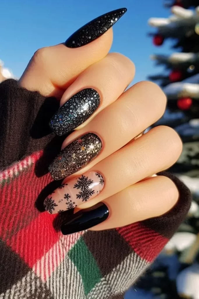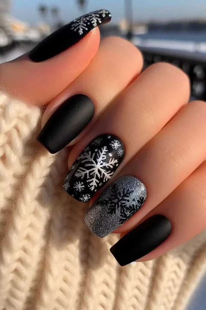 3. Uñas negras con copos de nieve y detalles de purpurina plateada.