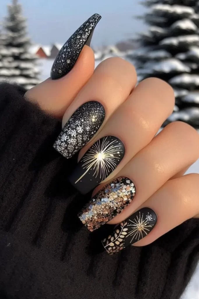 1. Uñas negras con fuegos artificiales dorados y plateados