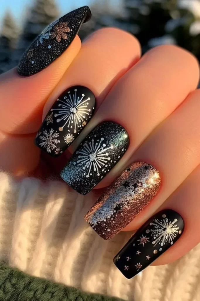 4. Uñas negras con fuegos artificiales plateados y detalles de brillo dorado.