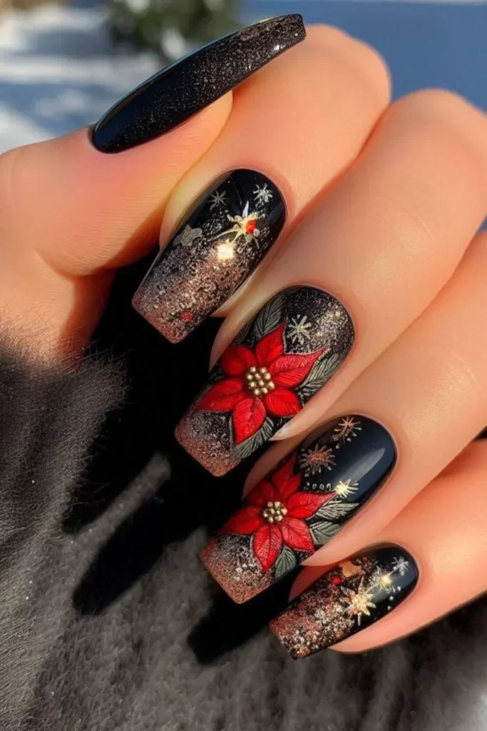 Este diseño luce uñas negras bellamente acentuadas con vibrantes flores de Pascua rojas y doradas. Los colores intensos sobre la base oscura crean un look festivo y elegante, perfecto para celebrar las fiestas.