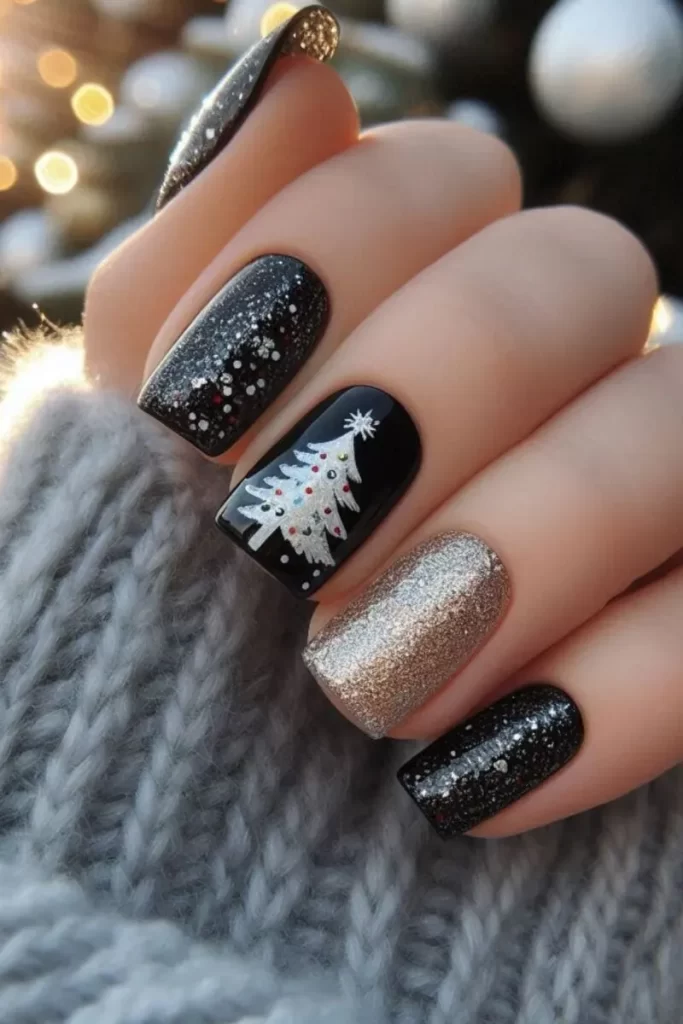 Este diseño presenta uñas negras adornadas con un elegante árbol de Navidad blanco. Los colores contrastantes crean un look llamativo y festivo, perfecto para celebraciones navideñas.