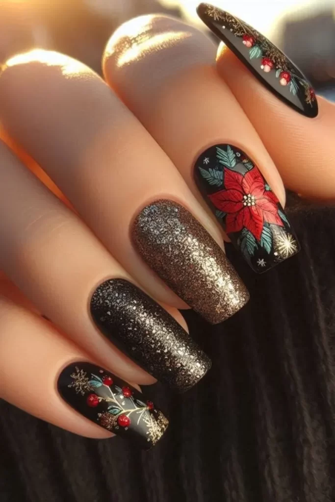 Este diseño presenta uñas negras y doradas, bellamente acentuadas con vibrantes bayas rojas e impresionantes flores de Pascua rojas. Los colores vibrantes y los motivos festivos crean un look elegante y alegre, perfecto para celebrar las fiestas.