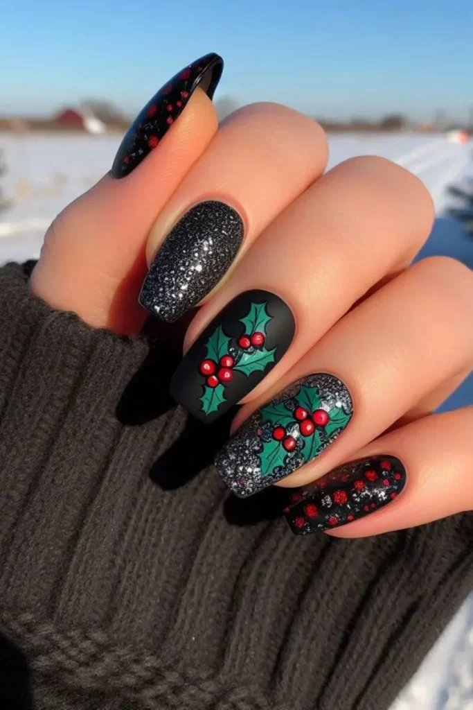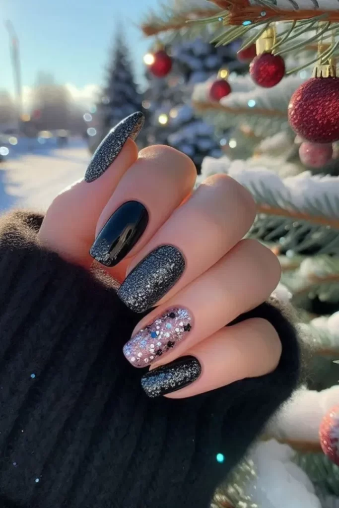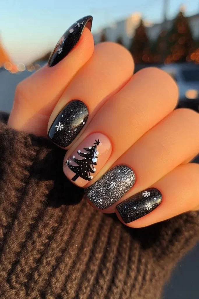 15. Uñas negras con árbol de Navidad y detalles de purpurina.