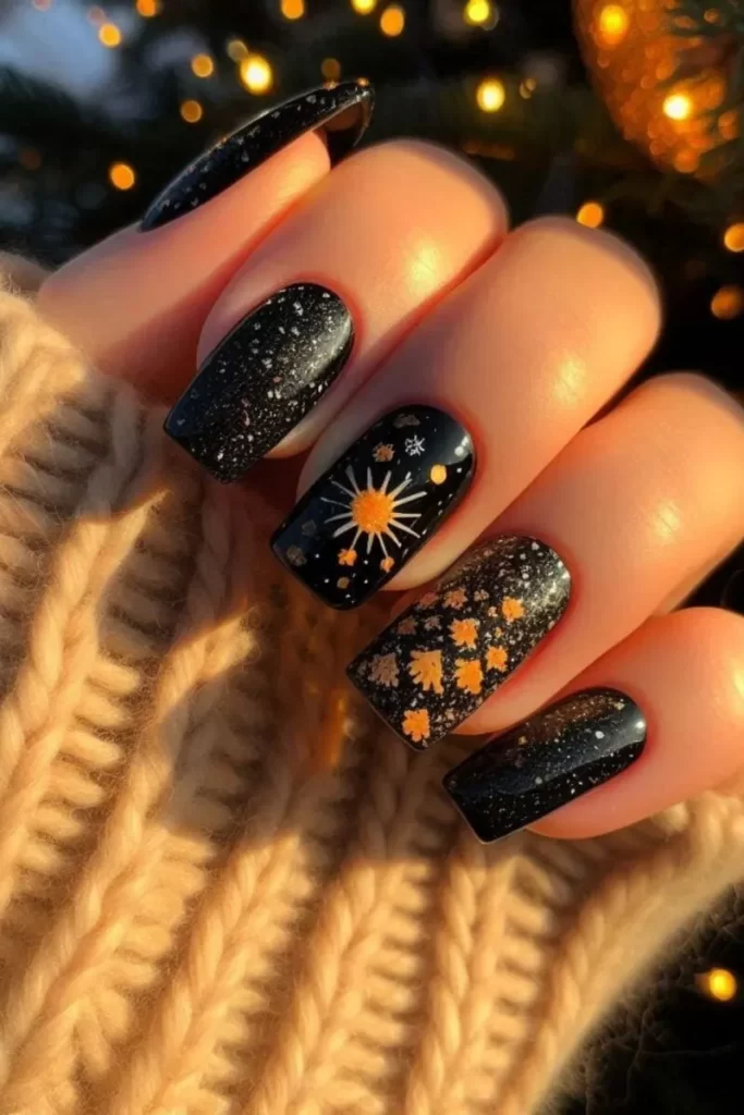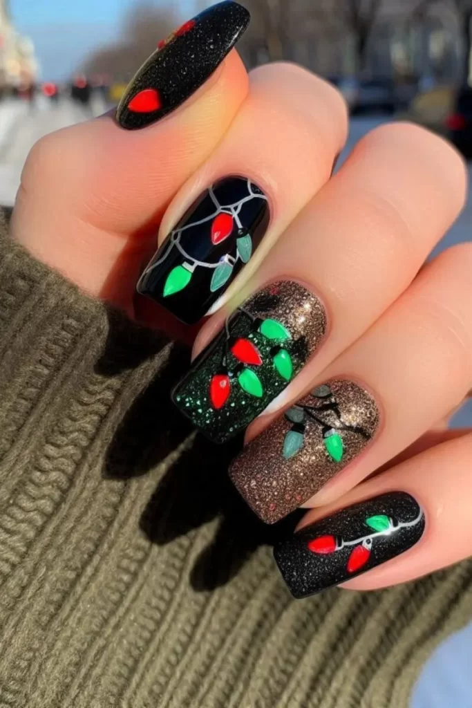 7. Uñas negras con luces navideñas y detalles de brillo.