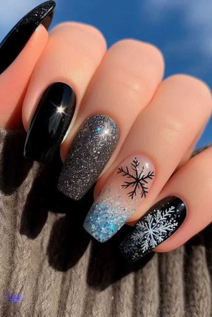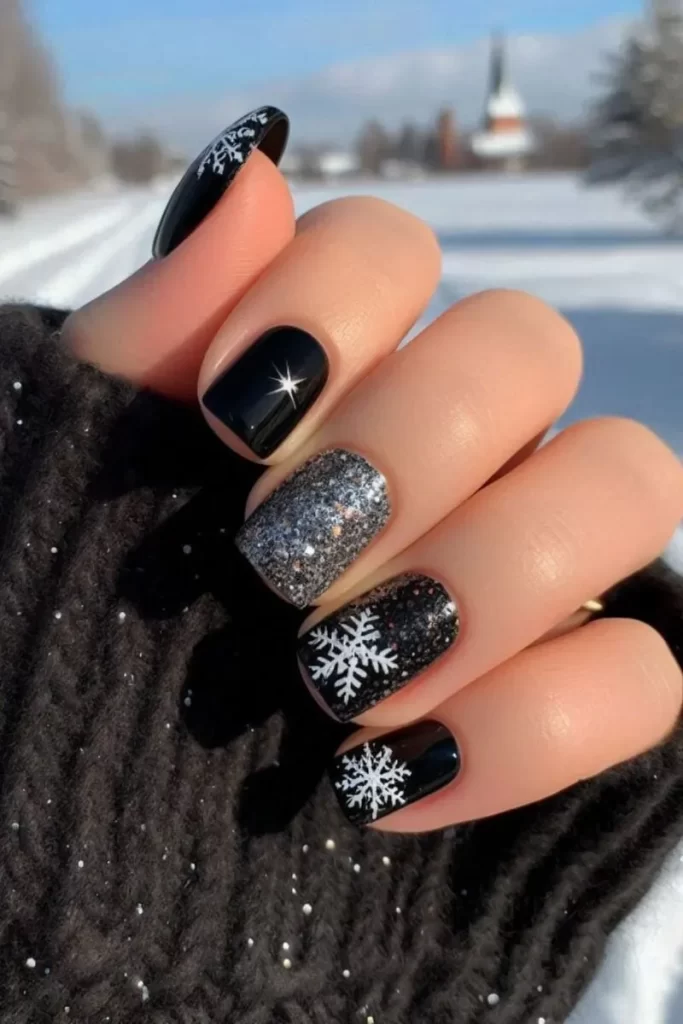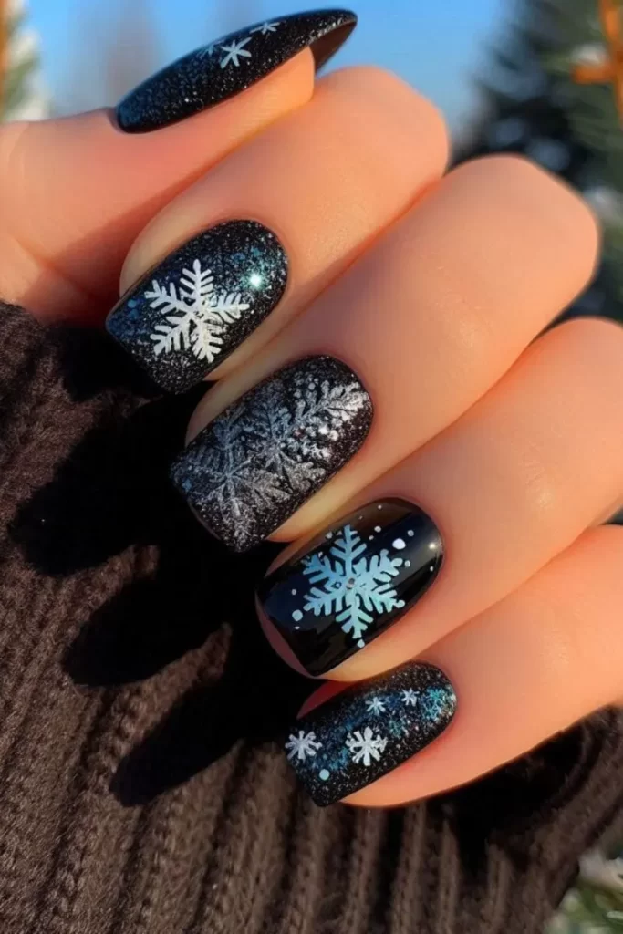 12. Uñas negras brillantes con copos de nieve y detalles de purpurina.