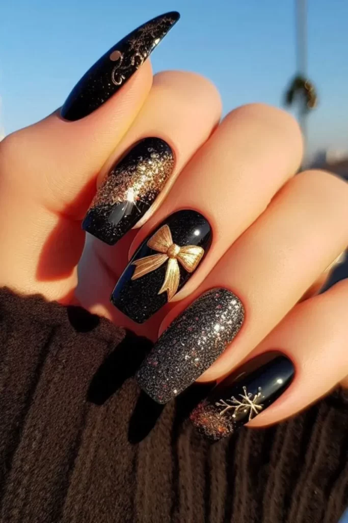 Este diseño presenta elegantes uñas negras con un lazo dorado, complementado con purpurina dorada y plateada. Los elementos brillantes aportan un toque festivo y lujoso, perfecto para celebraciones navideñas. Esta manicura combina sofisticación y brillo para un look festivo espectacular.