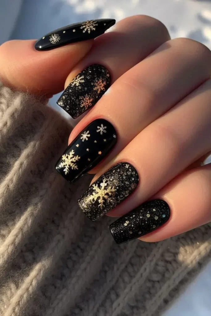 2. Uñas negras mate con copos de nieve dorados y blancos