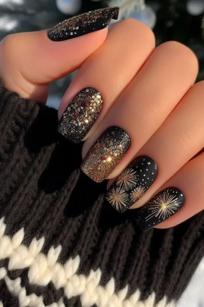 Las uñas negras mate crean una base elegante y moderna. Los copos de nieve dorados y blancos le dan un toque festivo. La uña central brilla con purpurina dorada, creando un contraste espectacular. Este diseño es perfecto para añadir un toque navideño a un look sofisticado.