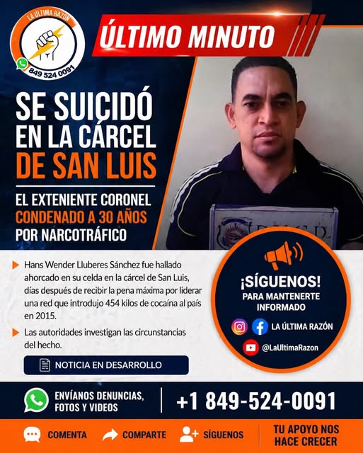 República Dominicana. Las autoridades penitenciarias y los organismos correspondientes investigan las circunstancias en que fue encontrado el exteniente coronel Hans Wender Lluberes Sánchez dentro de su celda en el centro penitenciario de San Luis, hecho que ha generado atención pública debido a que ocurrió pocos días después de que fuera condenado a 30 años de prisión por su vinculación a una estructura dedicada al tráfico internacional de sustancias controladas.