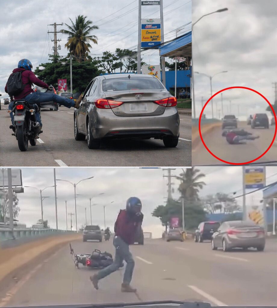 En las imágenes se puede apreciar al motociclista desplazándose cerca de un automóvil en movimiento. En medio de lo que aparenta ser una discusión o desacuerdo en la vía, el joven realiza una maniobra arriesgada y lanza una patada contra la puerta del vehículo. Segundos después, pierde el equilibrio de la motocicleta y termina cayendo sobre el pavimento, mientras otros conductores que se encontraban en la zona presencian la escena.